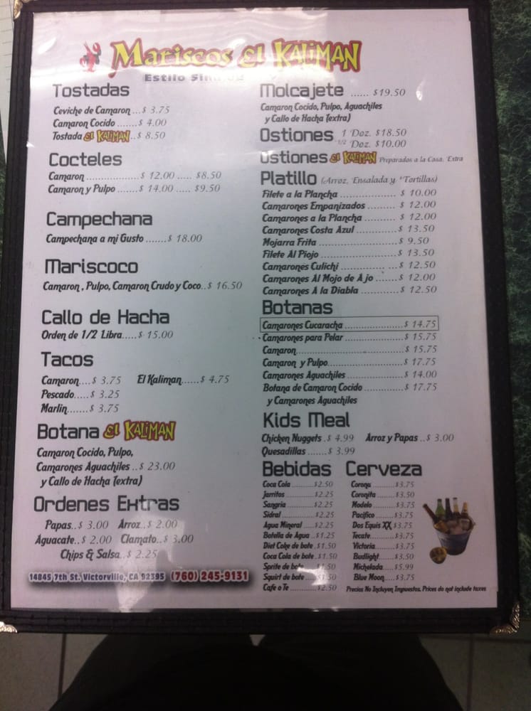 Diners rave about the rich variety of cocktails, like the Coctele de Camaron y Pulpo, showcasing the freshness of the ocean's bounty. The vibrant atmosphere is filled with friendly service, making every visit feel like a special occasion. Whether you’re in the mood for a casual bite or a cozy dinner, Mariscos El Kaliman is your go-to destination for seafood in the high desert.